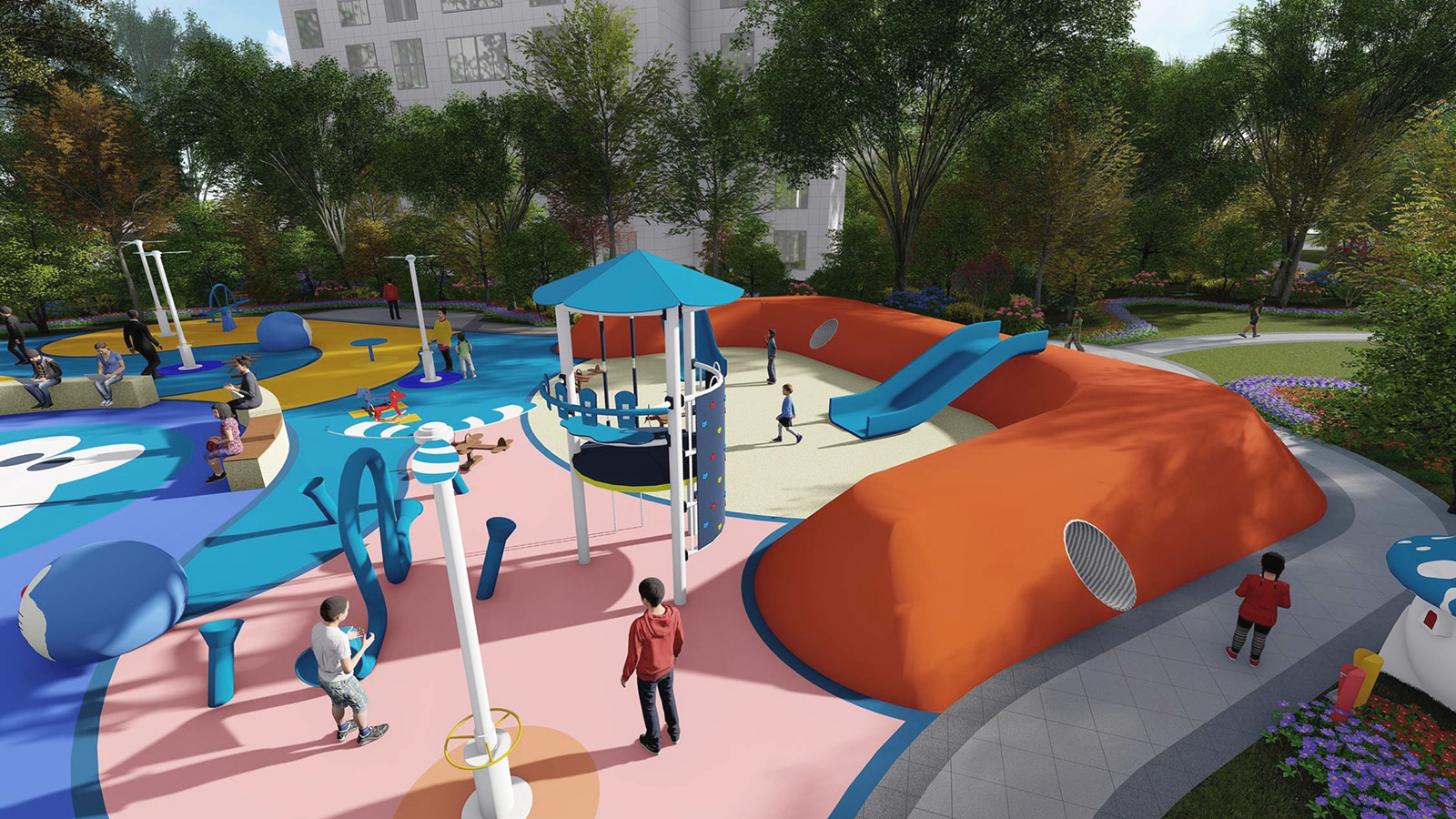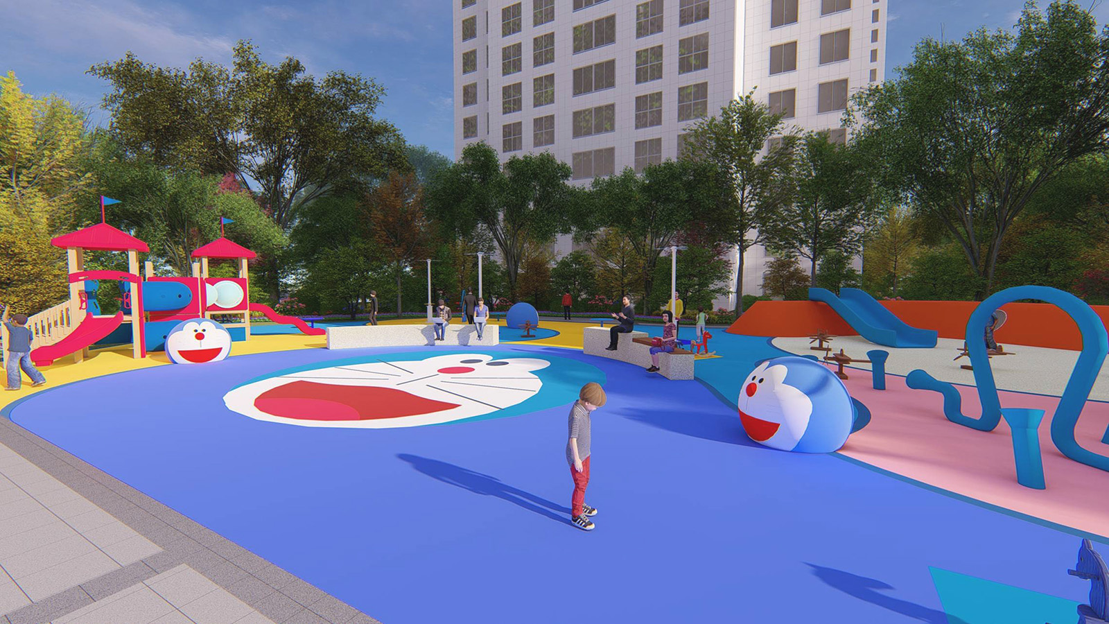 兒童活動區以五感體驗為設計理念,融入經典卡通形象“哆啦A夢” 為設計主題,通過新穎的互動性設計充分調動兒童的聽覺、視覺、味覺、嗅覺、觸覺體驗,使兒童獲得獨特的感官體驗的同時,童夢童享,啟發兒童想象力、創造力,并為整個家庭創造一個寓教于樂的優美園林空間環境。