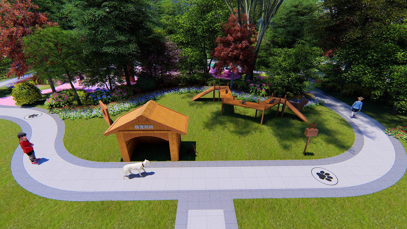 萌寵樂園組團綠地內布置萌寵步道、交友嬉戲場地,方便業主走出家門,日常散步遛狗的生活需要,布置寵物廁所(沙坑)、和糞便清理袋取用裝置、洗手池等設施,便于主人在訓練寵物后使用,保證周邊的衛生安全,