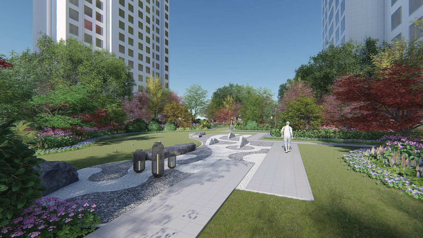 以新中式簡約設計手法描繪出完美的幸福社區生活氛圍,滿足全齡段不同業主的生活功能需求,依據幸福主題,對不同區域的組團賦予不同的主題功能,打造三大地塊五大幸福主題花園盛景。