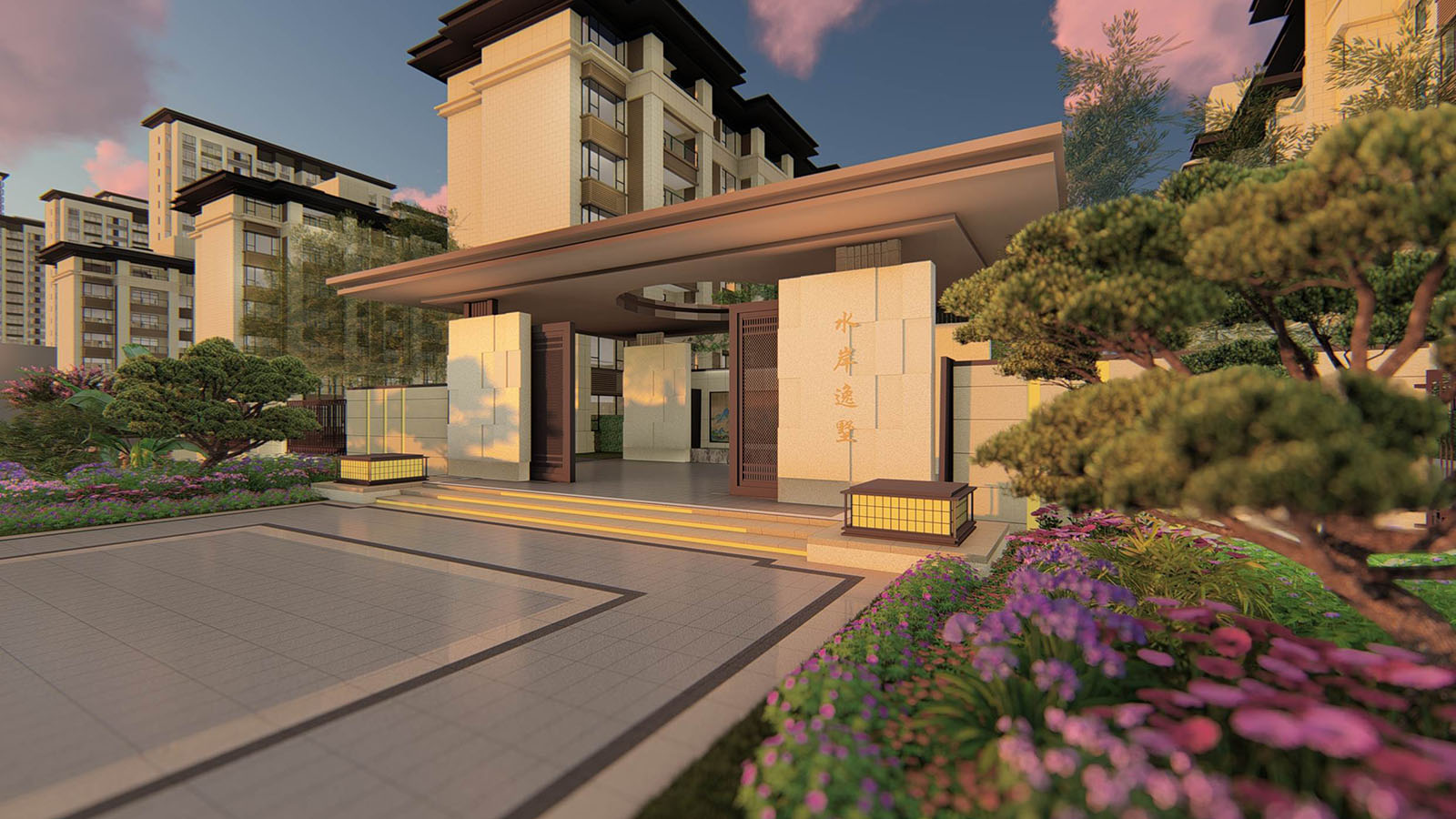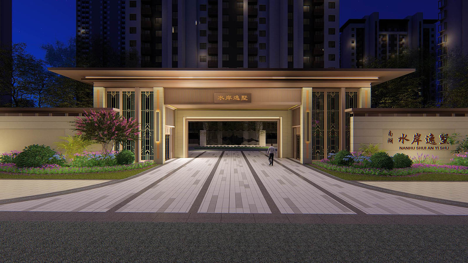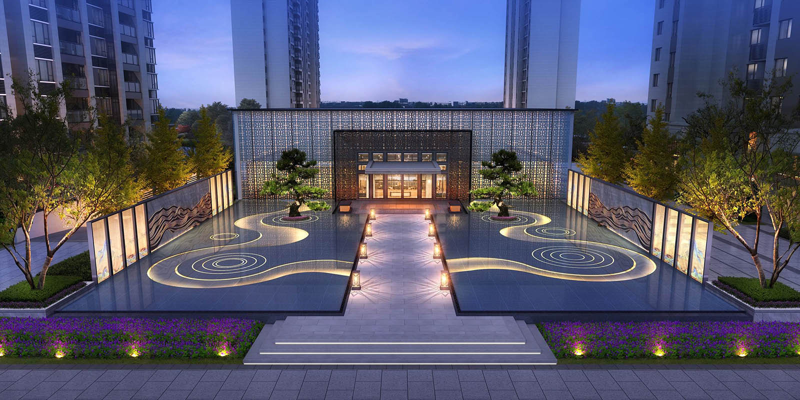 鏡面水景及景墻屏風的脈絡肌理與地塊東側的南湖相呼應,以此與南湖·水岸逸墅案名產生共鳴,景觀將月印萬川,處處皆圓為文化內涵具象,寓意萬川歸源,圓融無礙,精英階層的生活處事態(tài)度與精神追求。