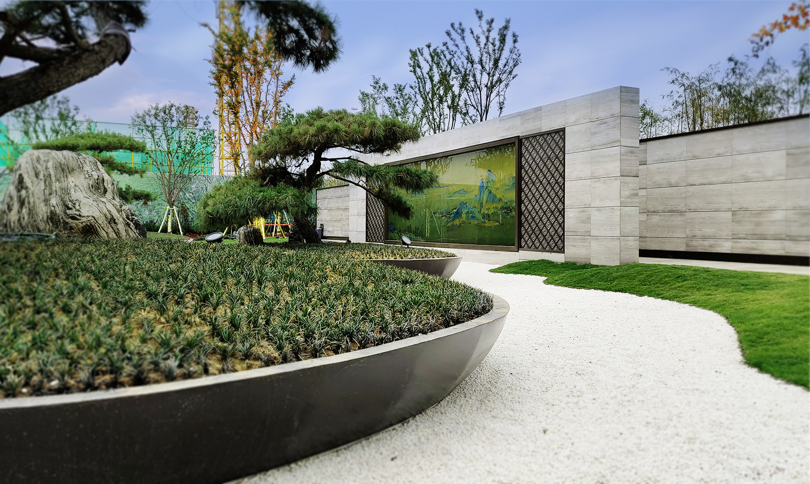 以山、水、亭、草坪的虛實(shí)變化描繪出一幅曠遠(yuǎn)之境 。