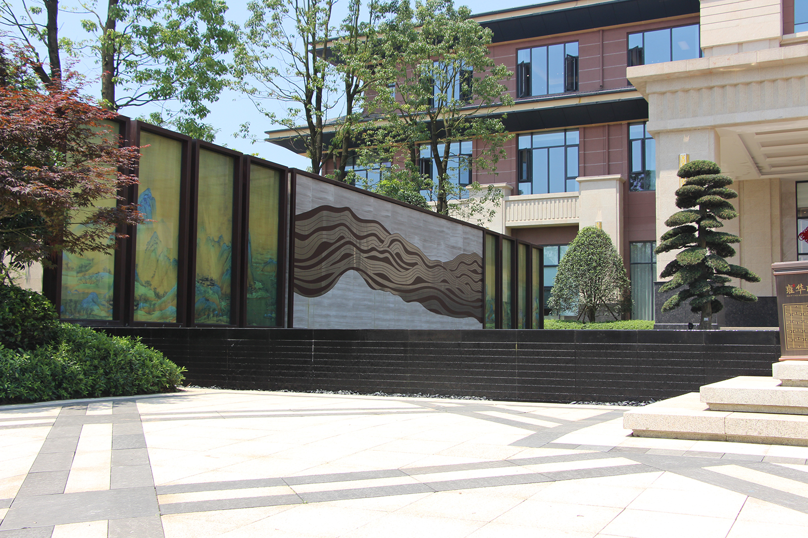 以真絲絹布打印青山綠水長軸,運用現代工藝,將絹畫夾在玻璃中間,中間景墻墻以高端法國木紋為背景,配合鋁板材質雕刻的山脈紋理,結合現代鏡面水景,利用朝夕的光影變化,仿佛古今交映,再現浩瀚江山壯美之境。