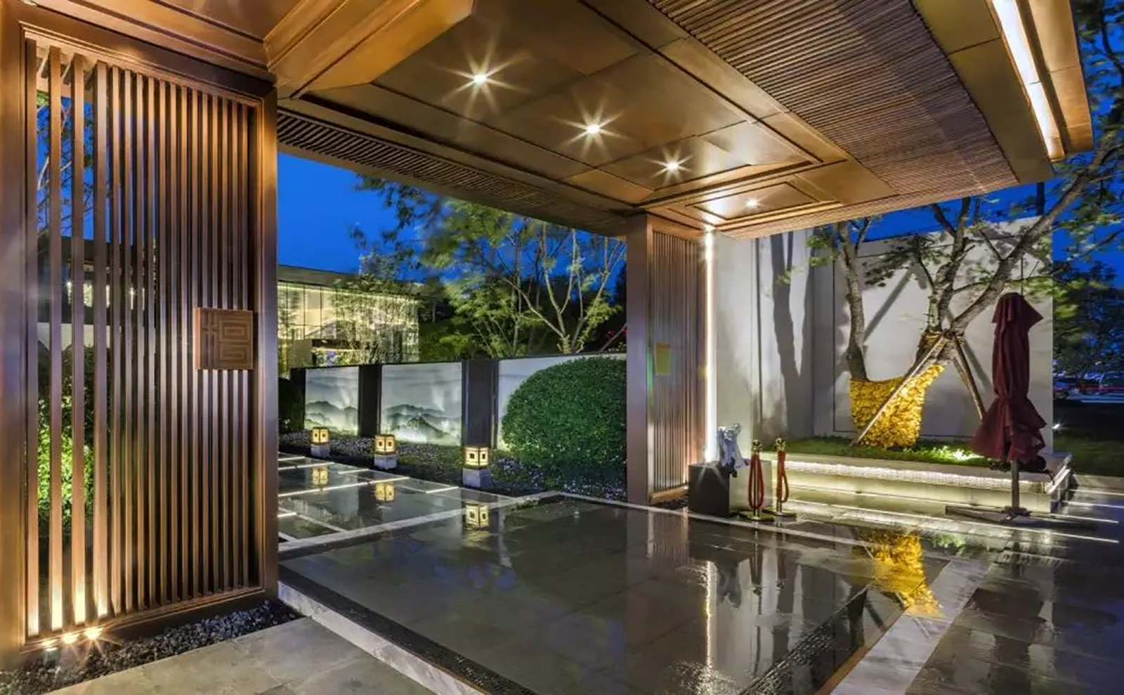 見禮檀園,府院初開,西入口門頭前場空間有限,景觀上采用 欲揚先抑的手法,以大禮東方、神韻在心為意境,將景觀在門頭后進一步表現,空間組織人車分流,中軸步道以“檀” 字紋為核心,兩側以云入境,如焚檀香以籠煙,林蔭清淺,天色清雅,業主歸家自然心境平和。