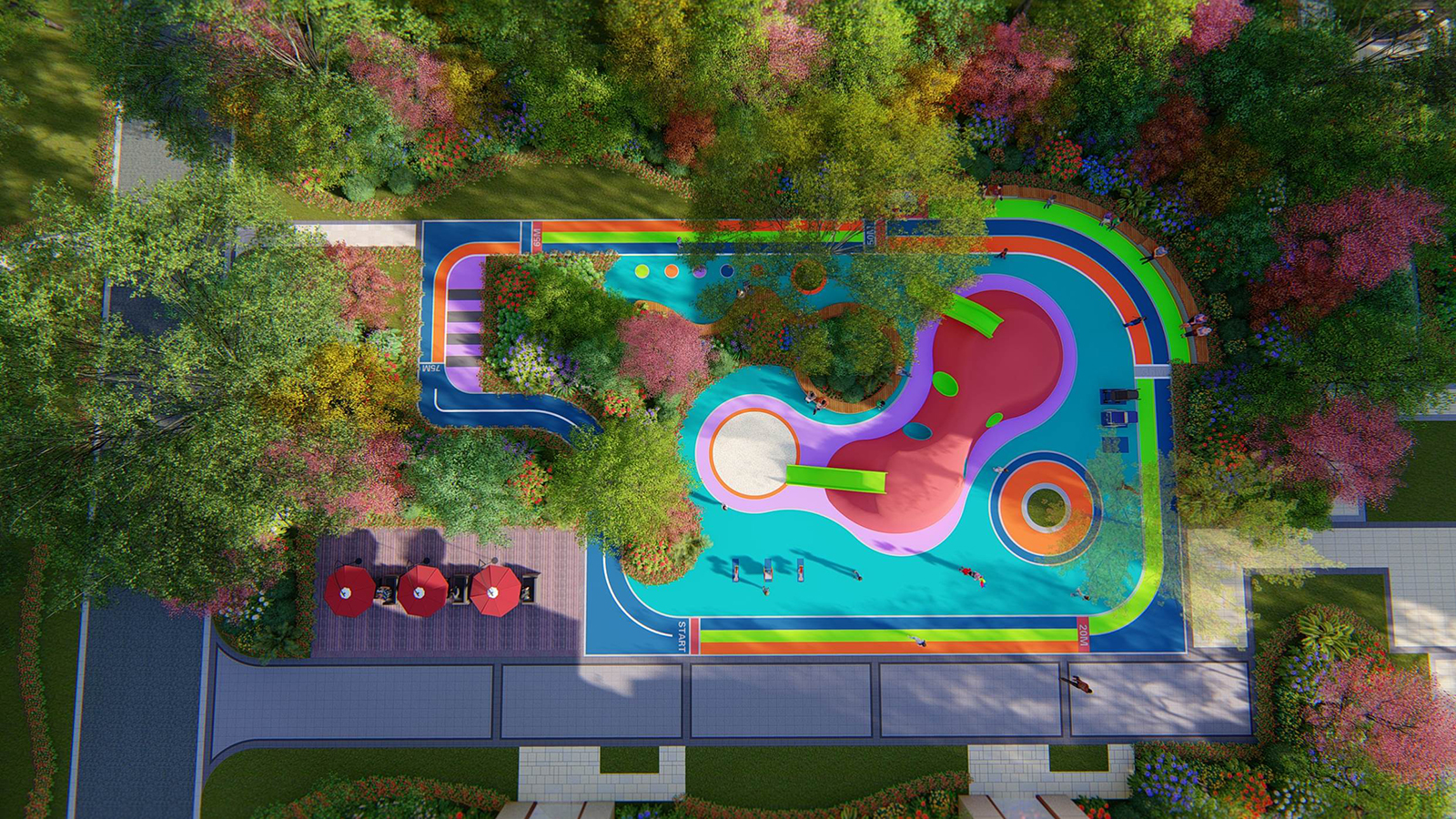 小朋友的喜愛及留戀,是場地設計成功與否的標尺。告別傳統的小塊場地、單調功能、邊角設計,深入研究各年齡段兒童的戶外活動方式與形態,營造出適合2-12歲全齡兒童的人性化活動場地,兼顧家長的看護與親子互動需求,在兒童活動區旁設置成人休息區,寬面座椅得以讓孩子和家長得以盡情放松休息,座椅倒角設計降低安全隱患,同時座椅高低組合排布兼具母嬰臺功能,座椅旁預留杯皿放置區,并設有室外洗手池,嬰兒車、殘疾人車停放位,環形兒童跑道、科學系統的利用空間。