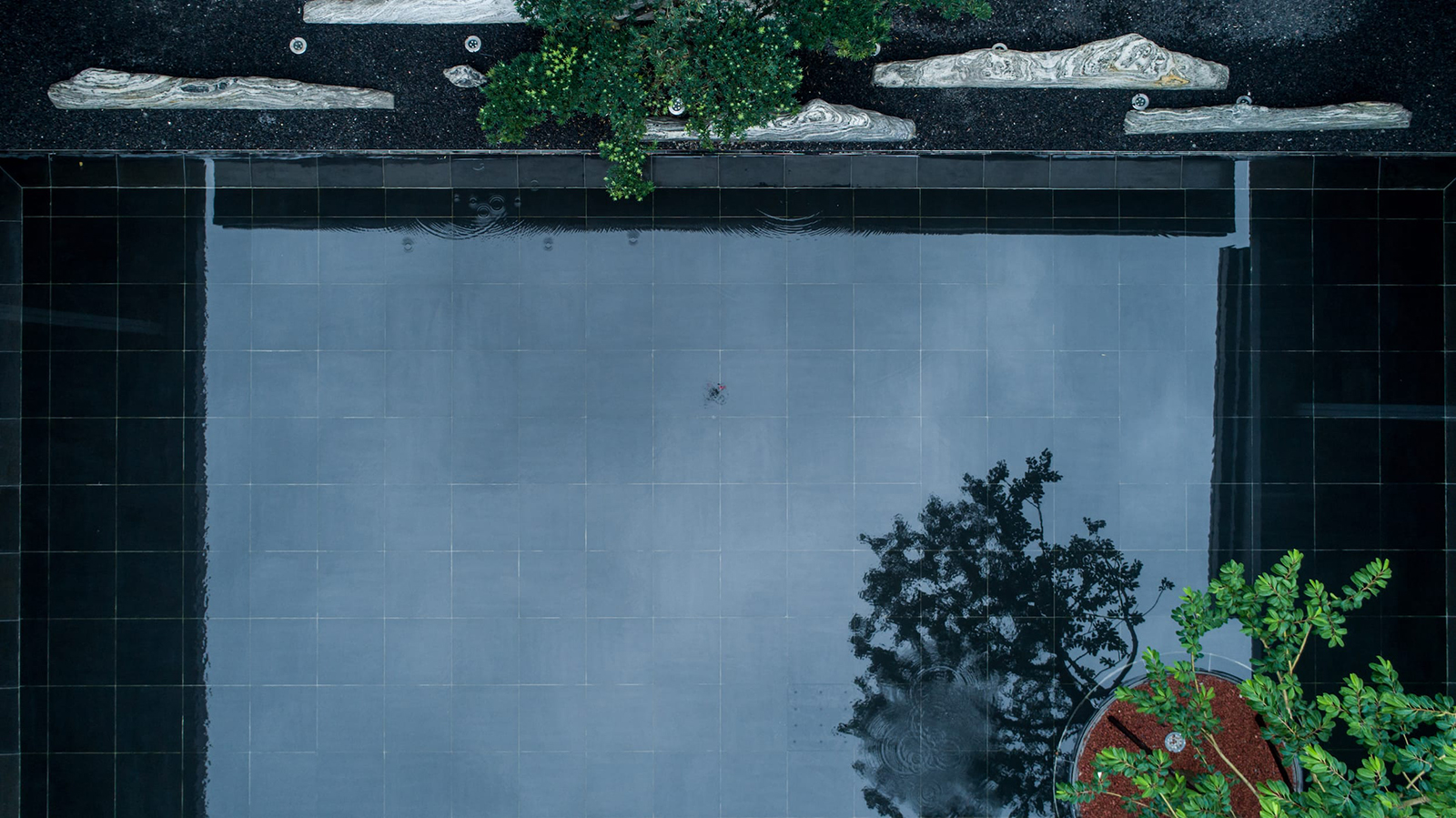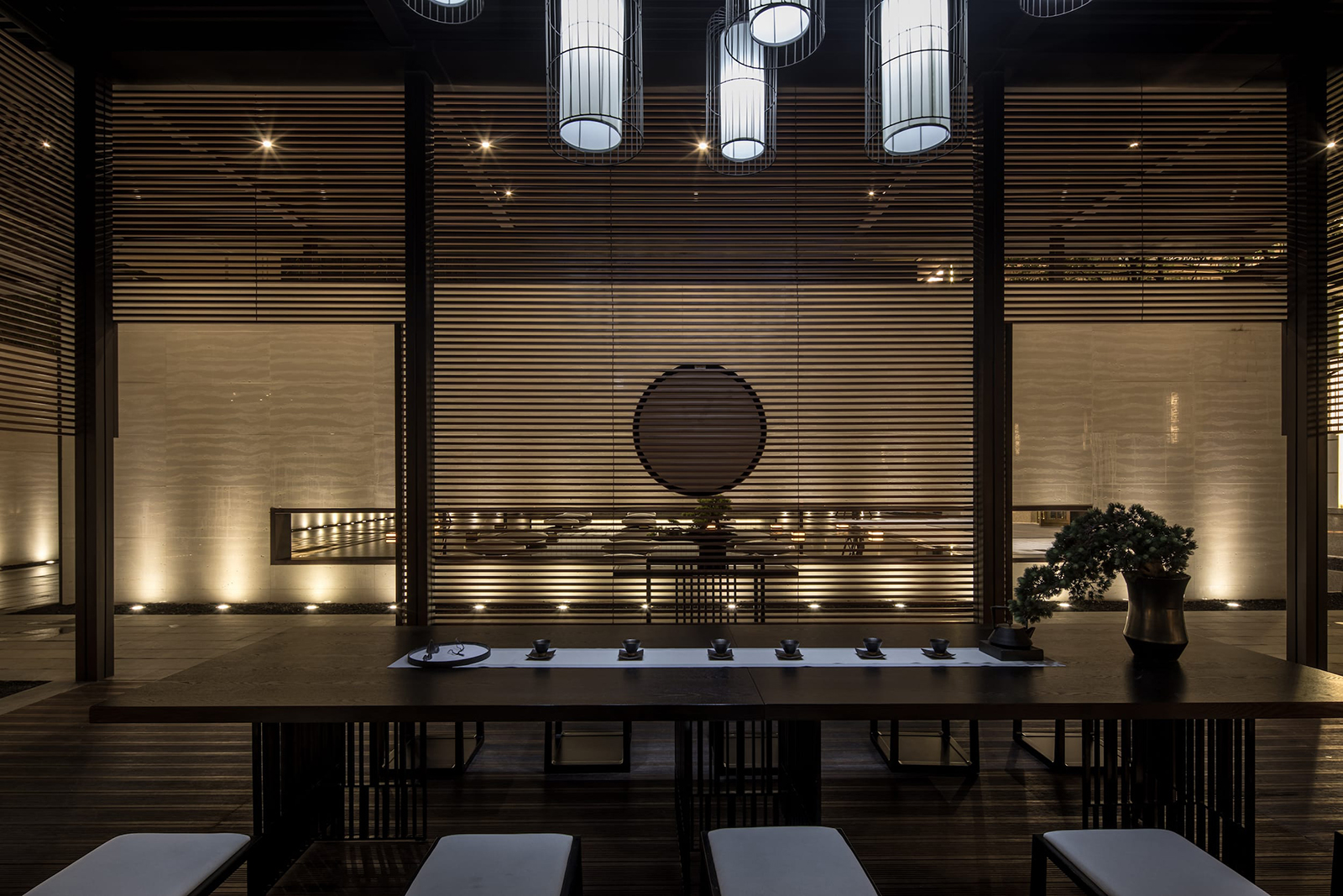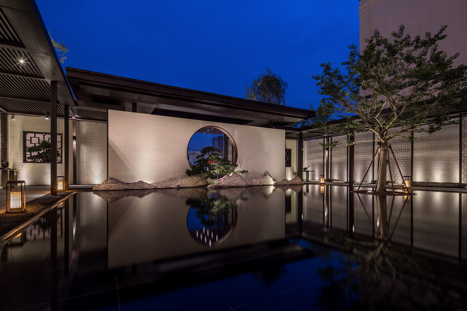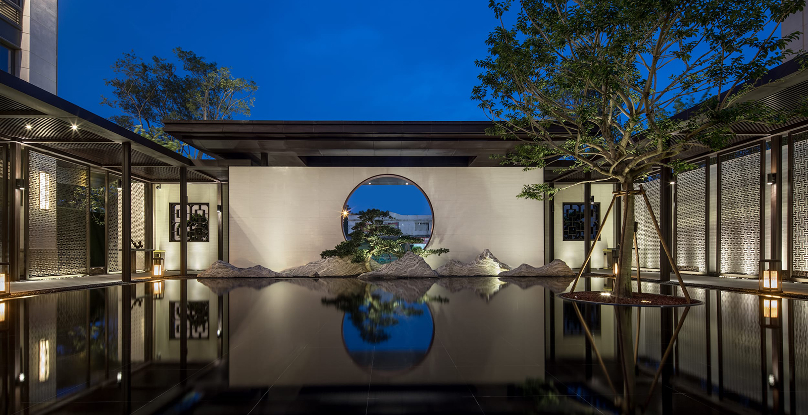 中心水景花園作為中軸核心,東入口向園而行,途徑極具東方雅韻的禪意枯山水,一橋轉折入境,借新中式設計手法,由虛轉實,虛實絞合,將山水理念融匯其中,鏡水回廊營造水天大境,張弛有度的描繪一幅大氣優雅的現代山水畫卷。意境脈絡從西入口至中園同樣的上演:穿過屏風、月洞景墻,藏著一片唯美山水畫境:水廊鏡天、松石浮玉皆歸此園。不分遠近,不知高下,月洞之后,更像一個故意的偶然,一點點構建游園的驚喜。