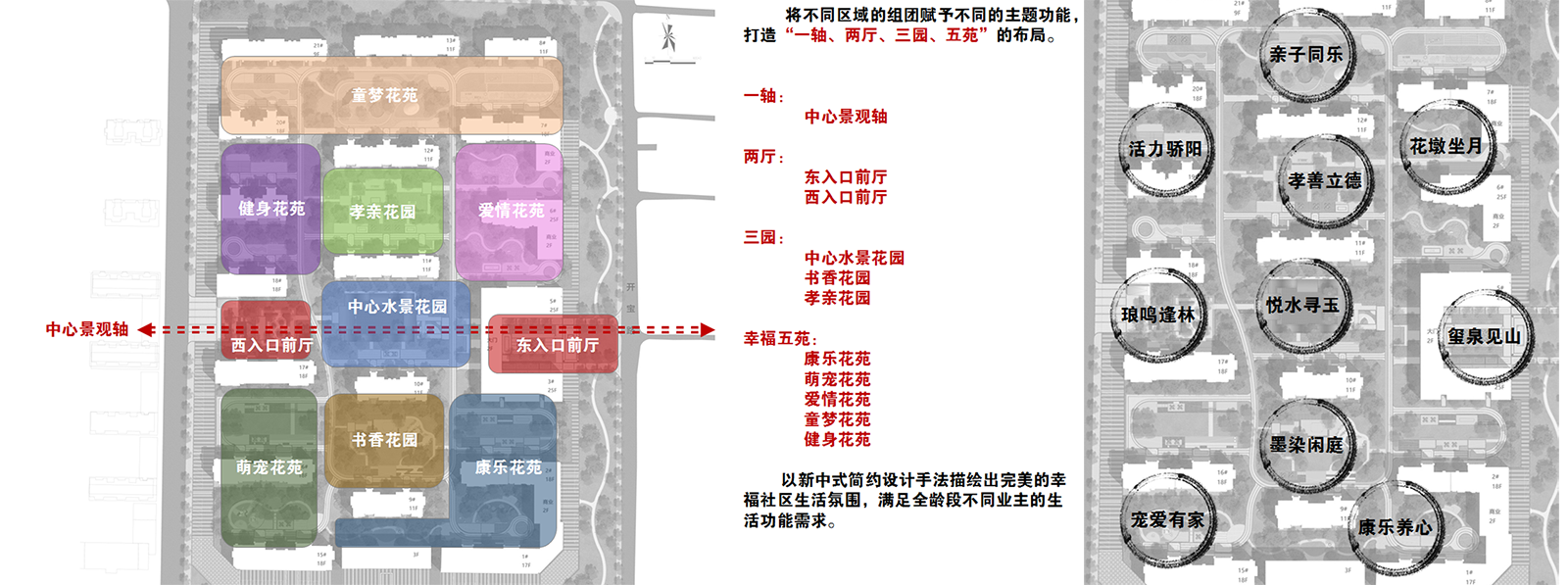》》》》一軸:提煉東西兩大入口,結合中心花園,將其形成一條主軸線,將禮儀與尊貴通過軸線展現出來,一軸定鼎璽瑯恢宏氣度,東方府境,園林與人文纏綿交織,山與水二物,人于園擷趣,或風或雅,賞心悅事,以此表現出璽瑯府的寓意和尊貴。