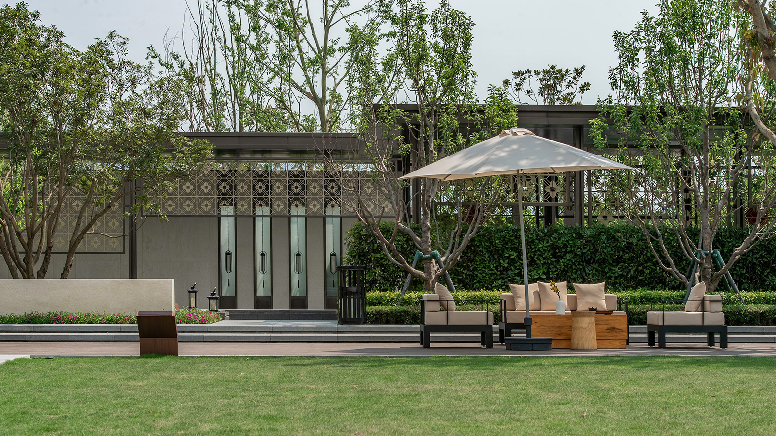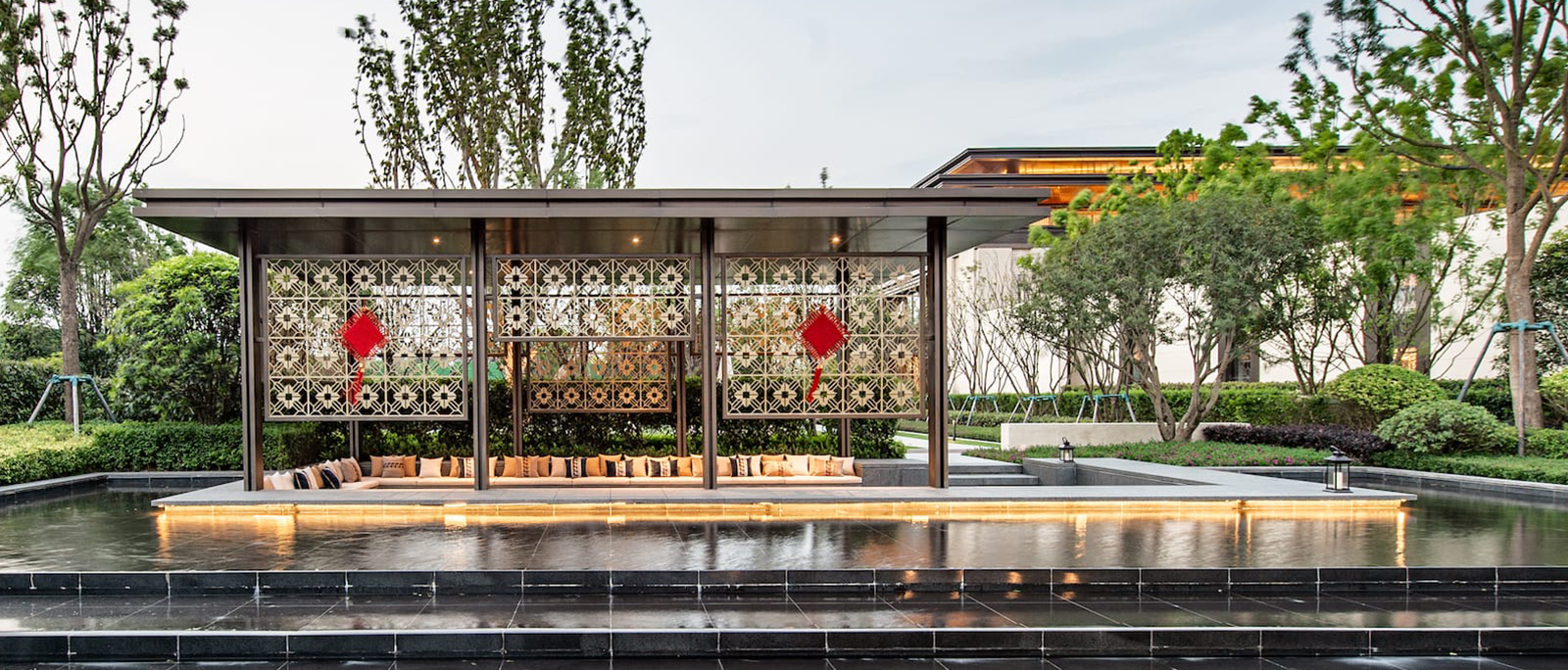 景觀延續新中式風格,采用當代的景觀設計語言表現傳統中國園林的精神內涵,將現代元素和傳統元素有機的結合在一起,以現代人的功能需求和審美愛好來打造富有傳統韻味的園林景觀,讓傳統藝術在當今社會得到合適體現。