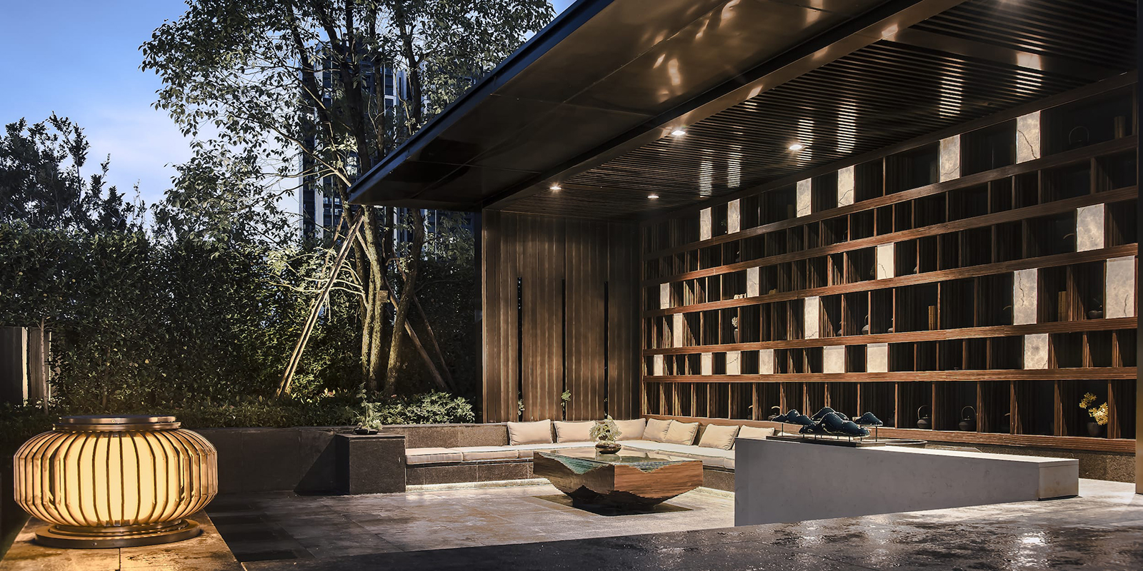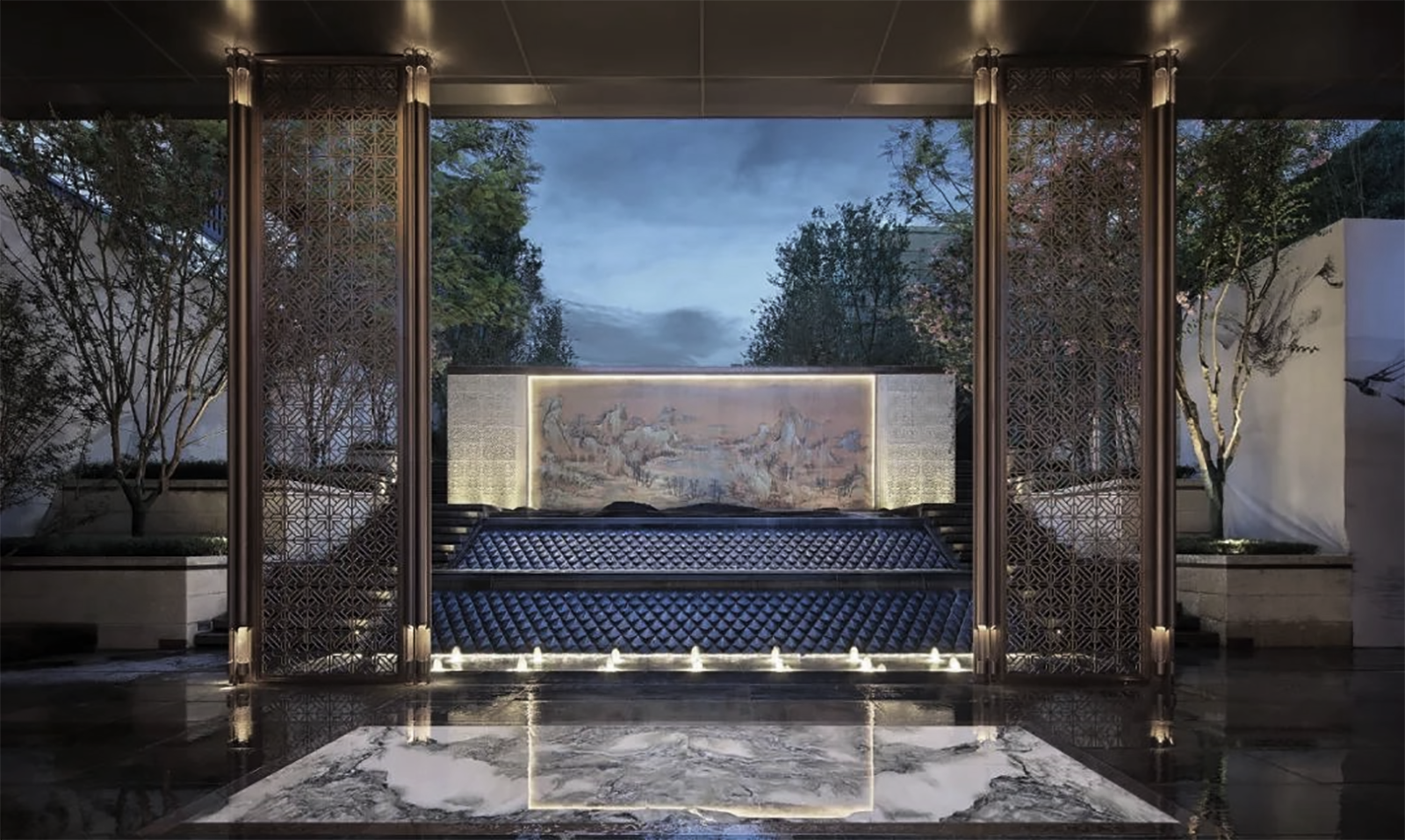 府院境的林泉是文人的林泉,將山水的形意融入到方寸的玉器上是古人表達喜愛的方式。西入口借助5.45米的內外高差,采用六寶歸家禮制,門頭、御燈、光階、疊水、照壁、三山六大景觀元素,禮溯一宅風水,規制禮儀,疊水瑯瑯如玉鳴,千里江山圖絹畫山水照壁,格柵之后設一池三山枯山水制境,兩側林蔭成趣,猶如境入山林,將臺、池、壁、光影等意境提煉、演化并植入場地,再現一幅具有文人林泉形意的現代山水畫卷。