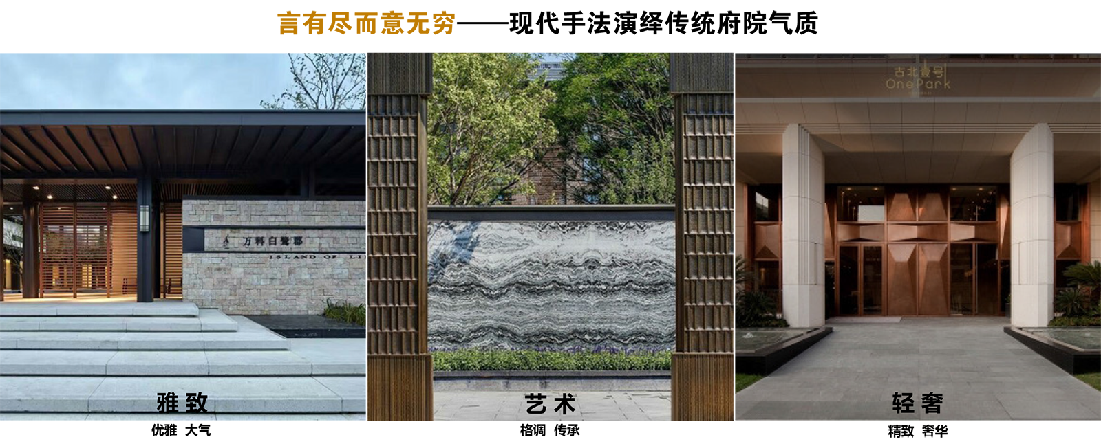 “璽”者:至高無上也,“瑯”從玉,良聲,形容似玉的美石,白玉無暇。汲取“璽瑯”意蘊作為文化主題內涵,并將其提煉為景觀設計元素,以傳統府園文化為基礎,延續文人園林格局。將“天人合一” 的園林思想融入場地,用現代手法演繹中式格調。在每一進空間中,融入展現 “玉石氣質” 的景觀元素,營造人文、境雅的藝術化景觀空間。
