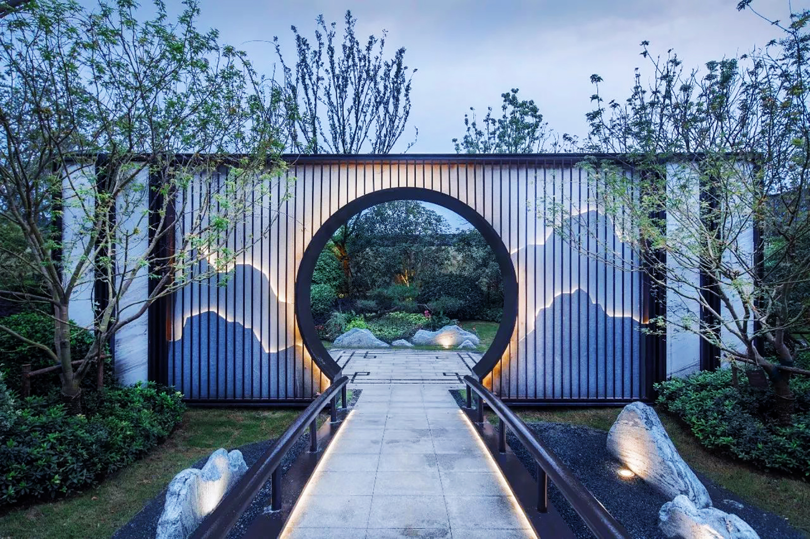 整個展示區景觀采用三進禮敘,一進精制禮儀,禮儀迎賓,二進后場景觀迂回式設計,百轉千回之后,一席東方府邸從容呈現,三進無邊際泳池水景展開,空靈靜美,引導業主進入具有濃郁東方韻味的山水之境。